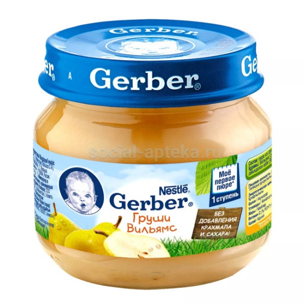 - Форма выпуска: Фруктовое пюре Gerber Груши Вильямс рекомендуется детям с 4 месяцев. Пюре богато витаминами и минеральными солями, пектином, способным выводить из организма токсические вещества. Содержит органические кислоты и клетчатку, благоприятно воздействующую на работу кишечника. Срок введения прикорма рекомендован в соответствии с методическими указаниями Минздрава РФ.