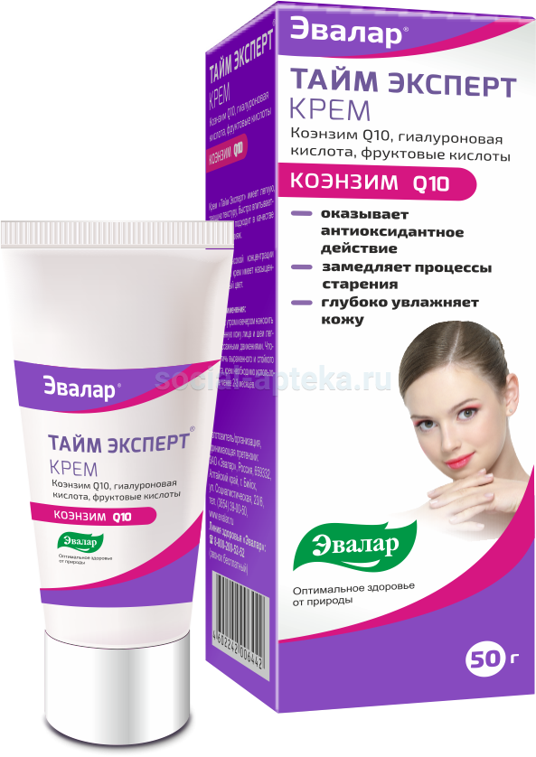 Восполнить недостаток коэнзима из продуктов практически невозможно. Сегодня во всем мире более 60 миллионов человек принимают коэнзим Q10. Тайм Эксперт - это улучшенная формула коэнзима Q10, антиоксидантная активность которого дополнительно усилена витамином Е. Именно такой состав обеспечивает эффективную защиту от старения. Крем «Тайм Эксперт» повышает способность кожи к самовосстановлению (регенерации), защищает от вредного воздействия окружающей среды (антиоксидантное действие), интенсивно увлажняет и питает кожу. А всего одна таблетка в день «Тайм Эксперт» замедлит процессы старения и позволит отсрочить возрастные изменения организма. Это поддержит работу сердечно-сосудистой системы, подарит свежие силы и поможет сохранить сияющий внешний вид, предотвратив образование морщин. Побеждайте время, оставайтесь молодыми и здоровыми с Тайм Экспертом!