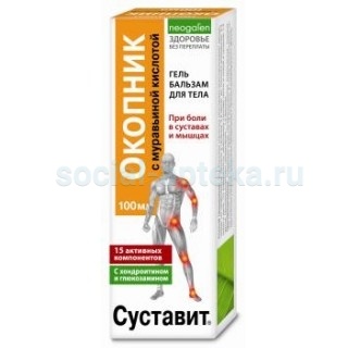 Гель-бальзам “Суставит. Окопник с муравьиной кислотой”- натуральное средство для профилактики заболеваний суставов и позвоночника, сбалансированный хондропротектор. Оказывает мягкое разогревающее действие, улучшает питание суставов. Обеспечивает суставы структурными элементами для активного обновления. Способствует сохранению упругости и гладкости хрящевых тканей, стимулирует их естественную регенерацию, препятствует развитию деструктивных процессов и старению суставов. Поддерживает функциональное состояние опорно-двигательного аппарата, снижает риск развития остеоартрозов и остеохондроза, оказывает противовоспалительное, противоотечное, спазмолитическое действие. В основе большинства заболеваний суставов и позвоночника лежит износ и разрушение суставного хряща. Поскольку в хряще отсутствуют нервные окончания, первые сигналы о заболевании мы получаем на достаточно поздних стадиях его развития - когда повреждение затрагивает костные и окружающие ткани или возникает воспаление. Поэтому при наличии факторов риска (в том числе возрастных) необходимо регулярное применение натуральных безопасных средств, содержащих специальные “строительные материалы” для суставов - хондроитин, глюкозамин и коллаген, а также питающие и противовоспалительные компоненты. Действие и эффективность геля-бальзама “Суставит. Окопник с муравьиной кислотой” обеспечены высокой биологической активностью натуральных компонентов, обладающих выраженными разогревающими, хондропротекторными, противовоспалительными, обезболивающими, противоотечными, спазмолитическими свойствами. Окопник (живокост, Symphytum) -Одно из самых популярных в народной медицине лекарственных растений, применяется в лечебной практике около 2 тысяч лет. О свойствах окопника говорит его родовое название: Symphytum - от греческого “symphytos" - сращивать, соединять. Стимулирует регенерацию костной и хрящевой ткани при заболеваниях суставов, улучшает качество синовиальной жидкости, заживляет суставные микротравмы, ускоряет сращивание костей при переломах. Аллан-тоин, главное действующее вещество окопника, включён в список препаратов ВОЗ. Муравьиная кислота (Formic acid) обладает очень высокой способностью проникать в ткани, усиливает местное кровообращение, оказывает согревающее, отвлекающее, местноанестезирующее, противовоспалительное действие, улучшает тканевой метаболизм. Воздействуя на нервные окончания кожи и мышечную ткань, вызывает рефлекторные реакции, сопровождающиеся образованием и высвобождением энкефалинов и нейропептидов, снижающих болевые ощущения. Содержит большое количество органических компонентов цинка, которые обладают антиоксидантным, противовоспалительным и иммуностимулирующим действием. Хондроитин сульфат - основной структурный компонент хряща и естественный защитник (хондропротектор) его клеток. Вырабатывается хрящевой тканью суставов. Повышает влагоемкость хряща, предотвращает его высыхание. Обеспечивает механические и эластические свойства суставных поверхностей, улучшает качество суставной смазки (синовиальной жидкости). Глюкозамина гидрохлорид - неотъемлемый элемент хрящевой ткани. Обеспечивает выработку хондро-итина, улучшает обменные процессы в суставах. Стимулирует производство глюкозаминоглюканов, необходимых 