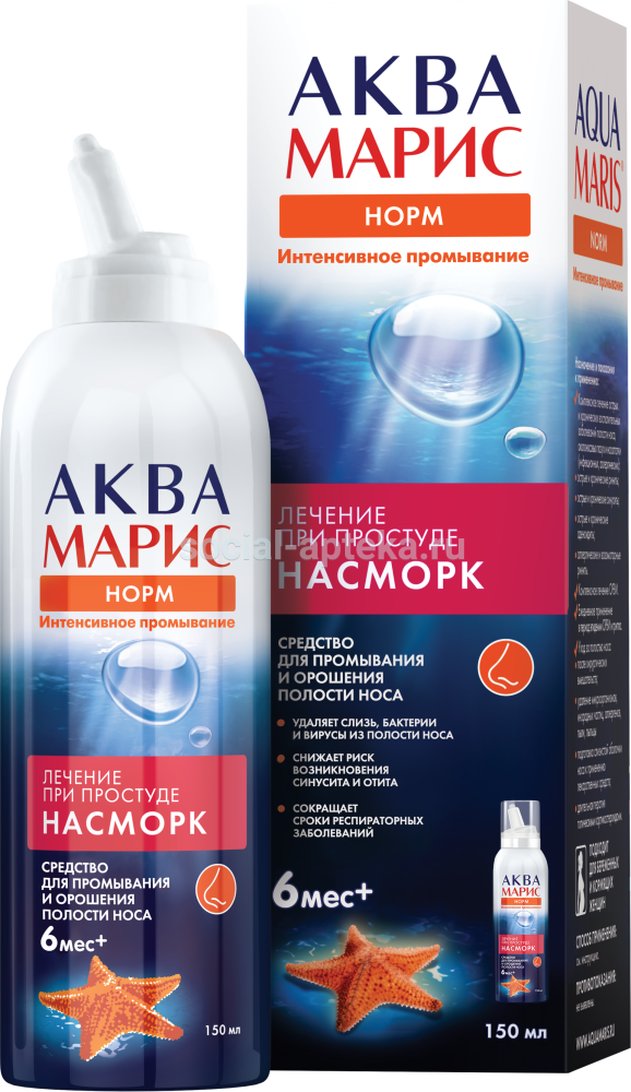 Изотоническая морская вода способствует поддержанию нормального физиологического состояния слизистой оболочки полости носа, способствует разжижению слизи и нормализации ее выработки в бокаловидных клетках слизистой оболочки носовой полости. После применения изделия Аква Марис повышается терапевтическая эффективность лекарственных средств, наносимых на слизистую оболочку носа, и сокращается продолжительность респираторных заболеваний. Изделие для промывания и орошения полости носа «Аква Марис» снижает риск распространения инфекции в пазухи носа и полость уха (гайморит, фронтит, отит). Снижает риск локальных осложнений и ускоряет процессы заживления после хирургических вмешательств (удаление аденоидов, полипов, септопластика и др.) на носовой полости. Снимает раздражение слизистой носа у лиц, слизистая оболочка верхних дыхательных путей которых постоянно подвергается вредным воздействиям (курильщики, водители автотранспорта, люди, живущие и работающие в помещениях с кондиционированным воздухом и/или центральным отоплением, работающие в горячих и запыленных цехах, а также находящиеся в регионах с суровыми климатическими условиями).