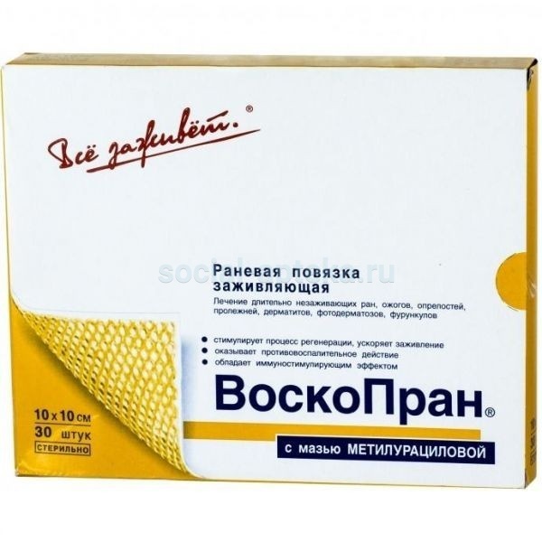 пчелиный воск 96,9%, прополис 3%, витамин Е 1 мг на 15*10 кв.см поверхности изделия; на поверхность покрытия нанесена мазь метилурациловая 10%.