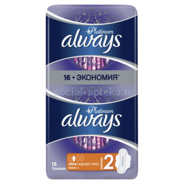 Ультратонкие прокладки Always Ultra Platinum Normal Plus Plus с верхним слоем-сеточкой обеспечат усиленную защиту на всю ночь. Дарят роскошную защиту и комфорт в любой, даже самый интенсивный день месячных, благодаря комбинации нескольких элементов. Новый верхний слой мягкий, как шелк, остается сухим во время использования. Специальные фиолетовые защитные зоны и улучшенный внутренний слой надежно впитывает жидкость и превращает её в гель. Ультратонкие прокладки Always Ultra Platinum нейтрализуют запах.