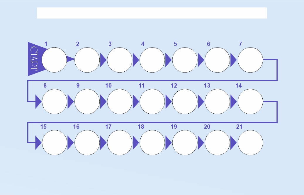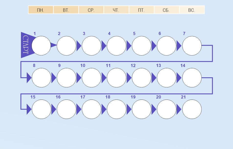 Прием таблеток всегда начинается с таблетки, помеченной «СТАРТ», а затем продолжается ежедневно по стрелкам.