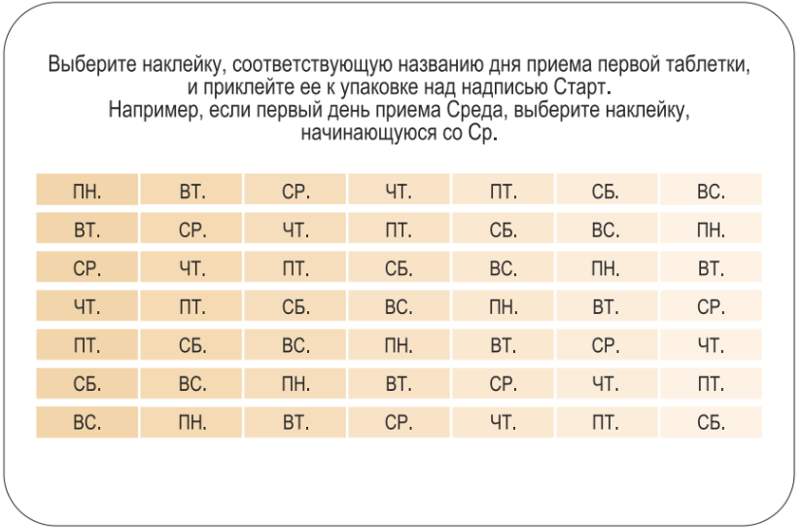 дие содержит 21 таблетку. Упаковка также содержит блок наклеек, состоящей из 7 самоклеящихся полосок с отмеченными на них названиями дней недели, необходимый для оформления календаря приема. Необходимо выбрать полоску, где первым указан тот день недели, в которой начинается прием таблеток. Например, если начало приема таблеток приходится на среду, следует использовать полоску, которая начинается со «Ср.» (рис. 1).
