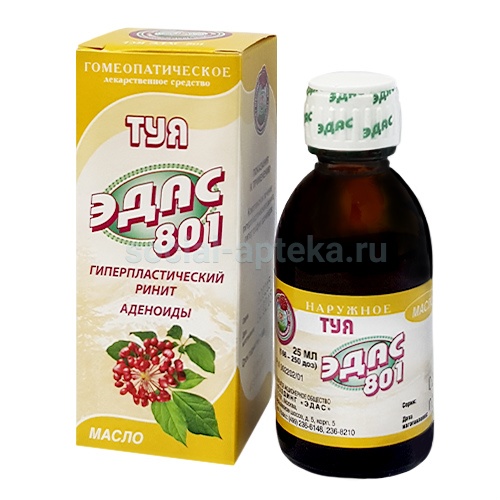 В качестве симптоматического средства при комплексной терапии: - хронического гипертрофического ринита; - аденоидов; - полипов носа; - отитов. Характерные симптомы к применению отдельных компонентов: Thuja occidentalis (Туя) D6 — Насморк затяжной со слизистыми выделениями или густыми выделениями зеленоватой окраски, гипертрофия слизистой оболочкой носа. Атрофия слизистой оболочки и сухость в носу. Аденоидные вегетации. Полипы носа. Хронический вялотекущий воспалительный процесс уха с серозным или гнойным отделяемым. Боли в суставах. Бородавки. Указанные симптомы характерны гипертрофическому риниту со слизистым или гнойным отделяемым. Атрофическому риниту с ощущением сухости в носу, аденоидным вегетациям, полипам носа, отитам, болям в суставах при артритах и артрозах. Для профилактики указанных заболеваний рекомендуется БИОЭНЕРГОТОНИК ЭДАС 03-01, содержащий в своем составе микроэлементы: цинк, марганец, селен, витамин С и биологически активные компоненты эхинацеи и перги. ТУЯ ЭДАС-801 применяется для лечения взрослых и детей. Совместим с другими фармацевтическими препаратами. Не имеет побочных явлений. Отпускается без рецепта врача.