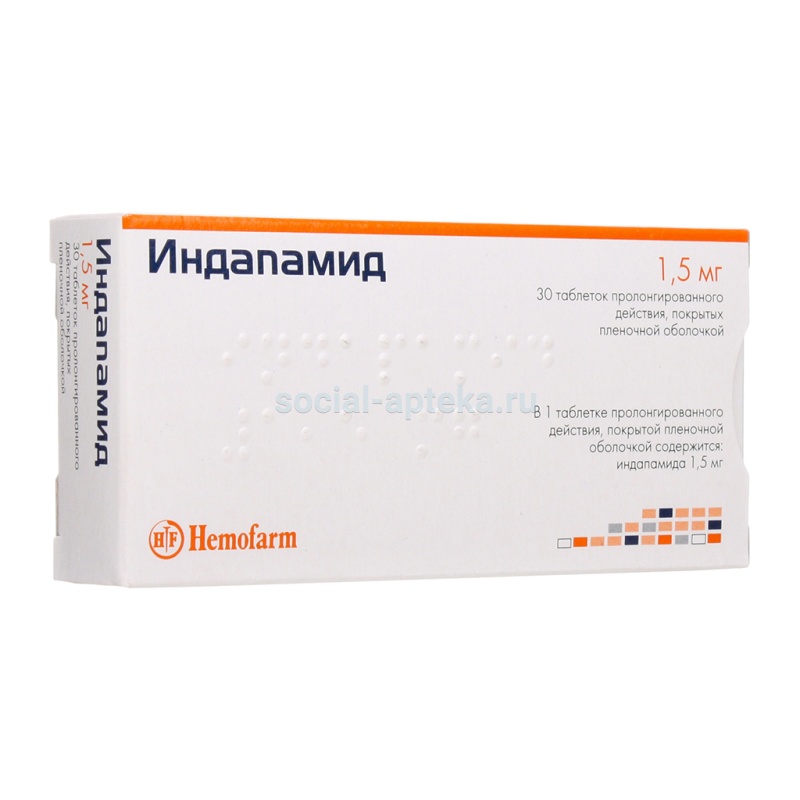 Действующее вещество: индапамид 1,5 мг; Вспомогательные вещества: крахмал прежелатинизированный; МКЦ; кремния диоксид коллоидный (аэросил); магния стеарат; гипромеллоза; макрогол; лактозы моногидрат; титана диоксид.