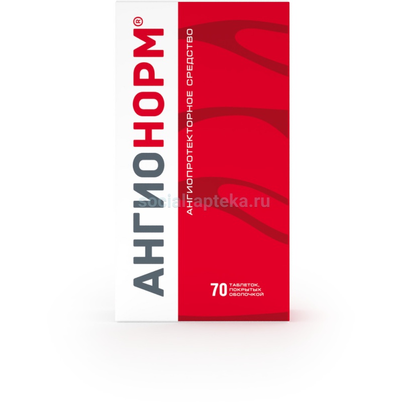 Активный компонент: АнгиоНорм® экстракт сухой (получаемый из смеси лекарственного растительного сырья - боярышника плоды, солодки корни, каштана конского семена, шиповника плоды с содержанием суммы флавоноидов в пересчете на авикулярин 0,50 мг) - 100 мг.