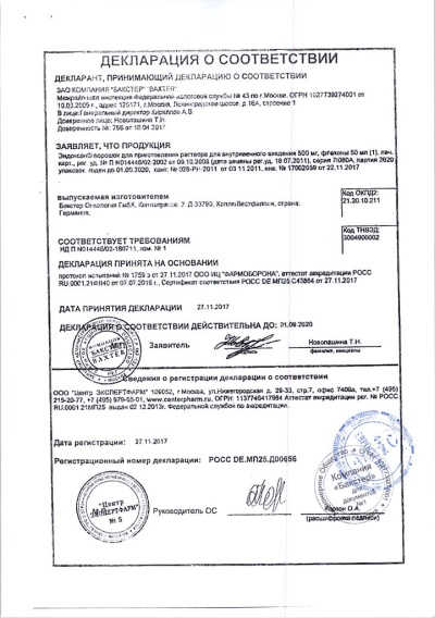 Раствор предназначен для внутривенного применения, которое желательно осуществлять в виде инфузий. Для кратковременного внутривенного введения приготовленный раствор препарата Эндоксан® добавляют к раствору Рингера, 0,9% раствора натрия хлорида или раствору декстрозы, доводя общий объем в соответствии с рекомендациями врача, например до 500 мл.