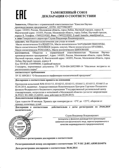 Флакон 100 мл.Химический состав: В составе масла присутствуют: Ненасыщенные жирные кислоты; Витамин Е; Тококоферолы; Каротиноиды - 11,1-18,6 мг%; Бета-каротин - приблизительно - 20 мг%; Лецитин; Метионин; Сквален; Фитостерины - 1,2-1,6 мг%. В фитостериновой фракции масла обнаружены: ситостерол, кампестерол, эргостерол, брассикастерол, десмостерол, неоэргостерол, стигмастерол. Витамины групы В, Витамины А, Д, РР; Пантотеновая кислота - 12-16 мг%; Фолиевая кислота - 2-3 мг%; Микроэлементы - цинк, железо, калий, сера, фосфор; Протеин; Аллантоин